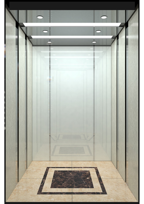 轎廂款型:YG-1641  天井:鏡面不銹鋼  兩側、后側板:兩側銀絲綢彩紋鋼板(GC26)+鏡面不銹鋼,后側超白烤漆玻璃+鏡面不銹鋼  前側板、門楣:鏡面不銹鋼  轎門:鏡面不銹鋼  地板:FL-PH09(拼花PVC)  操作盤(一體式):顯示屏:云端傳媒/其它:同BC-P5DT2